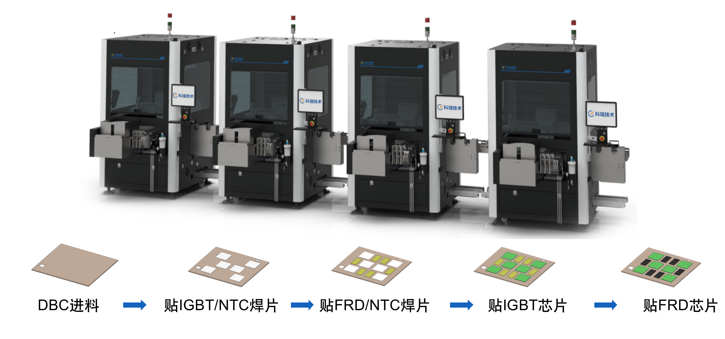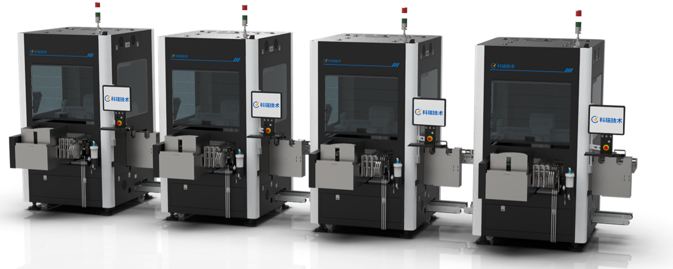 線體由多臺芯片焊片多功能貼裝設(shè)備組成,可根據(jù)不同的工藝流程靈活串線,滿足不同工序的CT差異,實現(xiàn)單一動作完成復(fù)雜貼裝流程,最大效率利用設(shè)備,提高產(chǎn)能。設(shè)備自帶下層載具回流功能,與前后自動上下料設(shè)備對接,實現(xiàn)整線全自動作業(yè)。